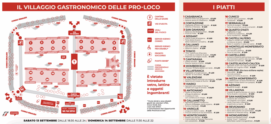 Per ulteriori dettagli, consultare il sito della manifestazione, che offre inoltre informazioni dettagliate su come arrivare ad Asti e raggiungere la piazza del Festival o scaricare il volantino del Festival delle Sagre Astigiane 2025.