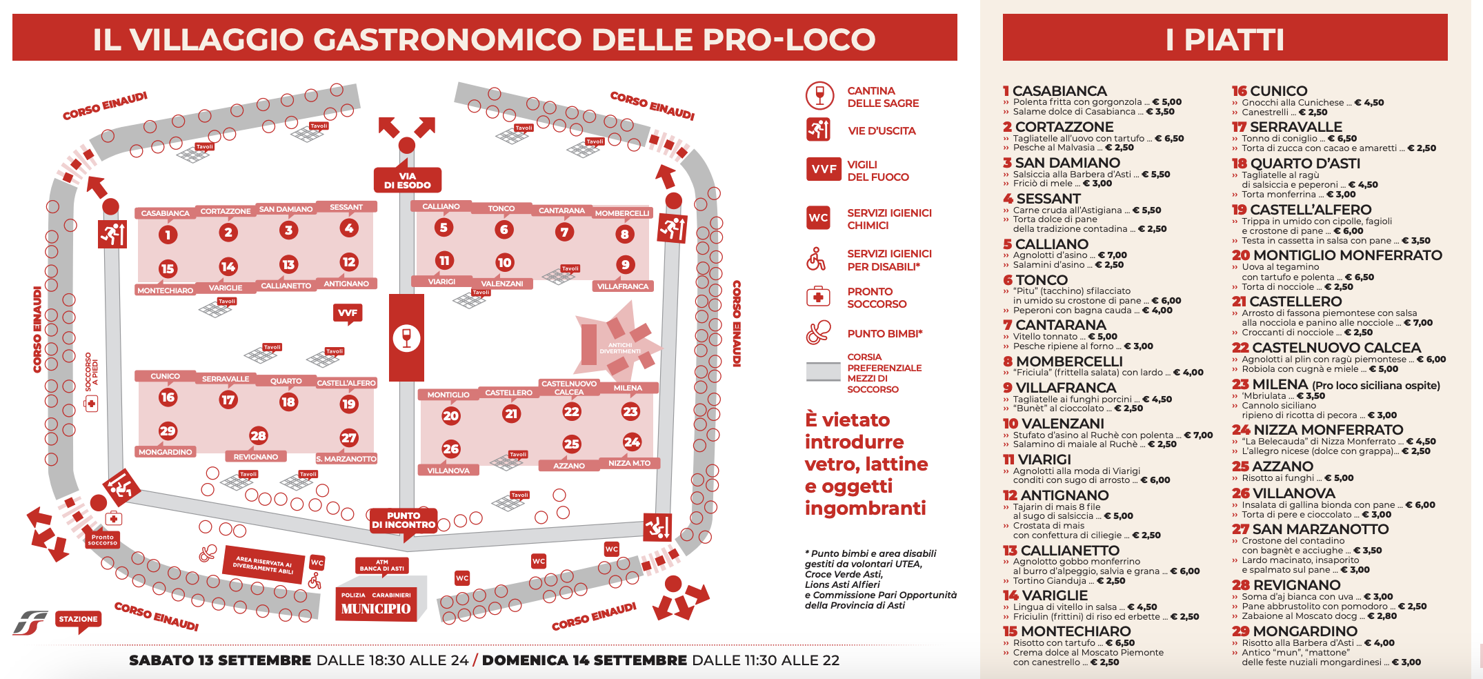 L’interesse delle migliaia di visitatori è ovviamente attirato anche dal grande villaggio gastronomico, denominato il più grande ristorante a cielo aperto d’Italia, dove 29 proloco di vari comuni della provincia astigiana (oltre all’ospite dalla Sicilia) offrono, nelle loro “casette“, un menù con più di 50 piatti della tradizione monferrina più pura: dalle friciule (pasta di pane fritta) condite con lardo alla bagna cauda, dai tajarin agli agnolotti dal plin al risotto alla barbera, dalla carne cruda alla trippa con le cipolle, dal bunèt al tortino d’Gianduja. Prezzi molto democratici (da 2,50 a 7 euro) da abbinare alla Barbera o altri vini DOC locali.