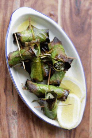 Lo stesso dicasi per il pesce (in particolar modo acciughe e trote) e per i frutti di mare (gamberi, ostriche), per i quali le foglie fungono da “cartoccio”. Per i pesci più grandi ci si può servire di spago da cucina per tenere le foglie aderenti alla superficie.